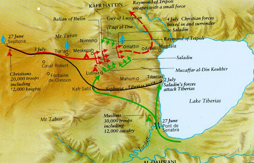 Mentre Baliano ed i suoi andavano verso Tiberiade per discutere con Raimondo, incontrarono un templare che gli correva incontro ferito ed insanguinato il quale raccontò cosa era accaduto. Erano stati informati di un esercito musulmano in terra di Galilea e, nonostante l’opposizione dei Gerolomitani, i Templari avevano deciso di attaccarlo nei pressi delle sorgenti di Cresson, dove i musulmani stavano abbeverando i cavalli, ma erano stati sterminati (solo due Cavalieri Templari e il Gran Maestro Gerardo di Ridford sopravvissero). Contemporaneamente, a Tiberiade, Raimondo vedeva tornare tranquillamente i mamelucchi che avevano mantenuto il tempo di ricognizione. Ma quando si avvicinarono notò che portavano sulle lance delle teste infilzate di cavalieri templari. Intanto Baliano arrivava a Tiberiade e trovò Raimondo terrorizzato e conscio di una situazione da lui stesso creata. Si decise a rompere il trattato con Saladino e a recarsi a Gerusalemme in segno di sottomissione che fu amorevolmente accettata (alla fine aderì anche Boemondo di Antiochia, commosso dalle richieste urgenti di aiuto di Guido, che inviò un contingente al comando di Baldovino di Ibelin). Si era ricostituita una unità in un momento in cui arrivarono notizie di Saladino che ammassava truppe nell’Hauran, al di là della frontiera in corrispondenza del Mar di Galilea. Ed anche ad Acri, per la fine di giugno si radunarono le forze cristiane accorse dopo la chiamata a tutti i vassalli, valvassori, Templari, Gerosolimitani: 1200 cavalieri armati completamente, oltre 12000 cavalieri locali armati alla leggera (chiamati turcopoli, cavalieri di sangue misto), circa 10 mila fanti. Fu chiesto al Patriarca Eraclio di venire con la reliquia della Vera Croce ma il poverino, indisposto ma in realtà occupato con una delle sue amanti di nome Paschia, inviò il Priore perché consegnasse la reliquia al Vescovo di Acri.