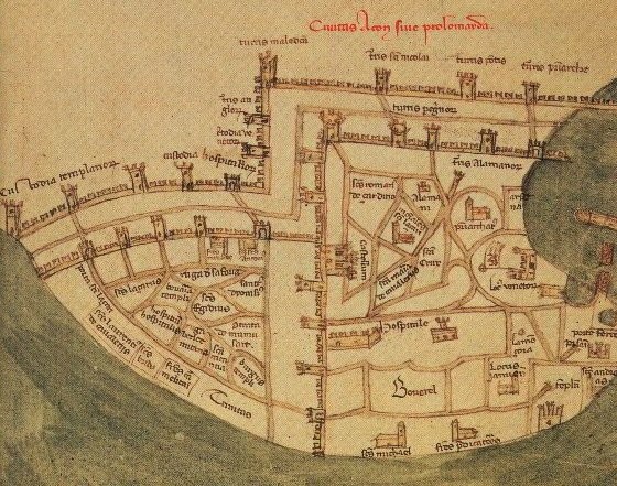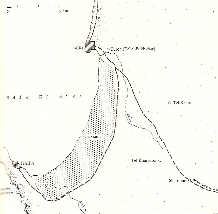 Acri e dintorni nel 1189. Acri si trovava su una piccola penisola, e la città a Sud ed Ovest era protetta dal mare e da una muraglia. A Sud vi era il molo che si spingeva fino ad una grande roccia su cui vi era un forte chiamato Torre delle Mosche. Dietro il molo vi era un porto protetto da tutti i venti tranne che da quelli di terra. A Nord ed a Est la città era difesa da grandi mura che a Nord-Est si univano ad angolo retto con un forte chiamato la Torre Maledetta. Le due porte di terraferma si trovavano alle due estremità del muro. Verso il mare una grande porta si apriva sul porto ed un’altra più oltre. Dentro la città, la guarnigione era rifornitissima di viveri ed acqua.