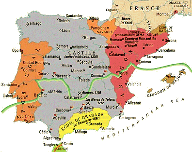 La situazione in Spagna prima della Reconquista del Regno di Granada. In grigio il Regno di Castiglia, in rosso il Regno di Aragon, in Arancio in alto il Regno di Navarra, in giallo il Regno di Granada. Dal matrimonio di Isabella di Castiglia con Fernando di Aragon nasce il Regno di Spagna al quale nel 1492 si aggiungerà il Regno di Granada e nel 1512 il Regno di Navarra.