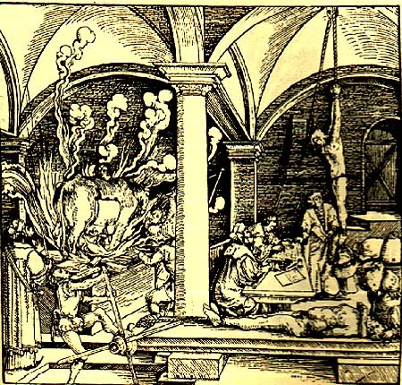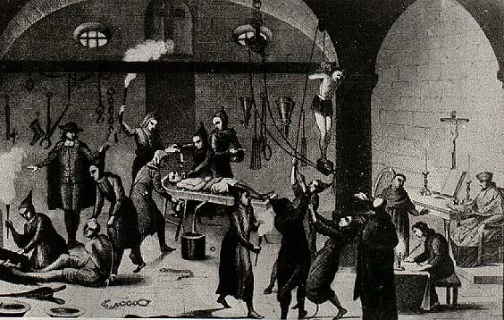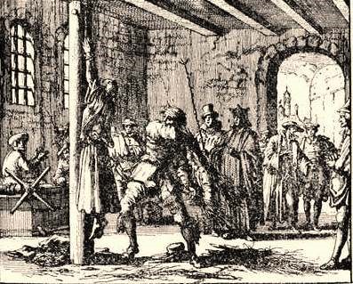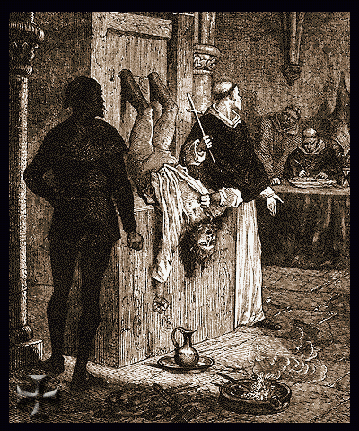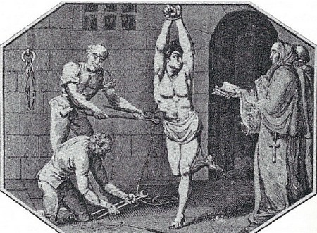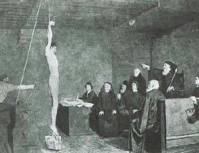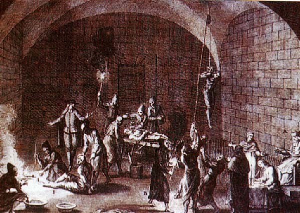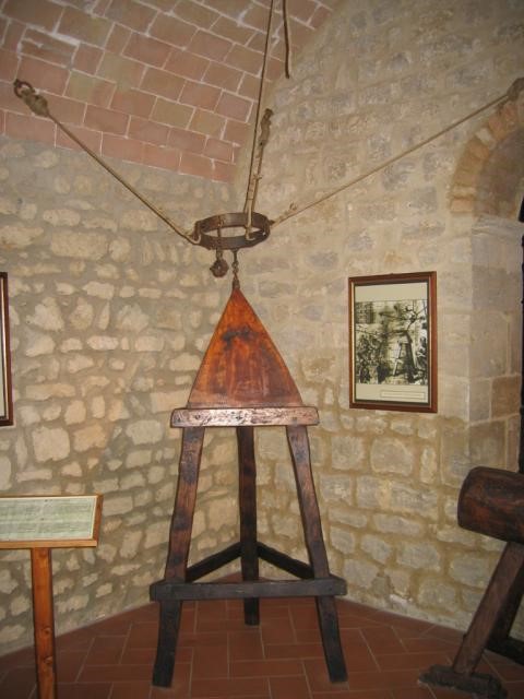 Una sala della tortura in cui: a sinistra si vede il vitello di ferro, strumento dentro il quale veniva sistemato il torturando e sotto il quale si accendeva un fuoco; a destra in basso lo stiramento; a destra in alto la sospensione.