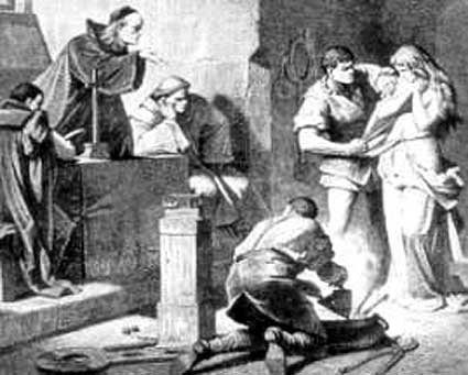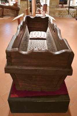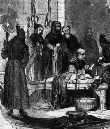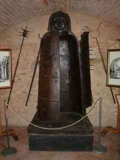 La vergine di ferro o di Norimberga. Chi veniva accusato di eresia o di atti blasfemi contro Dio o i Santi, se si rifiutava ostinatamente di confessare la propria colpa, veniva condotto in una cella, il cui lato estremo ospitava numerose lampade, posizionate intorno al recesso, che gettavano una luce variegata sull’aureola dorata, sulla testa della figura e sul vessillo che questa teneva nella mano destra. Su un piccolo altare, il prigioniero riceveva i sacramenti; in seguito due ecclesiastici lo esortavano insistentemente a confessare in presenza della Madre di Dio. “Vedi” dicevano “quanto amorosamente la Vergine ti apre le braccia! Sul suo petto si scioglierà il tuo cuore duro; lì confesserai!”. Tutto a un tratto, la figura cominciava a tendergli le braccia: il prigioniero, sopraffatto dallo stupore, veniva all’abbraccio ed ella se lo portava sempre più vicino, arrivando a stringerselo al petto finché i pungiglioni e gli aculei lo trafiggevano.Tenuto fermo in quella stretta dolorosa, il prigioniero veniva interrogato e se si rifiutava di confessare, le braccia della statua stringevano sempre più il suo corpo, inesorabilmente e lentamente, ammazzandolo. La parte anteriore di questo marchingegno, consisteva in due porte che si chiudevano. C’erano una gran quantità di pugnali inseriti sia nella parte interna del petto che dentro alla statua in modo da trafiggere con precisione il fegato, i reni e gli occhi. Chi subiva l’abbraccio della vergine di ferro dopo essere stata stritolato rimaneva attaccato alle punte dei chiodi e delle lame quando la Vergine riapriva le braccia. http://itnetbsd.altervista.org/gizm0/torture/17.html