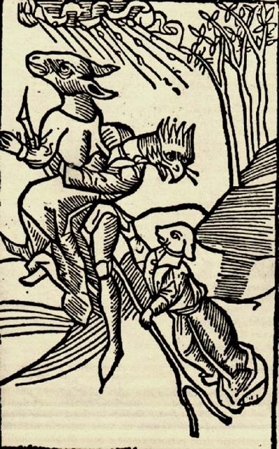 Strega in volo a cavallo del diavolo in una delle sue trasformazioni