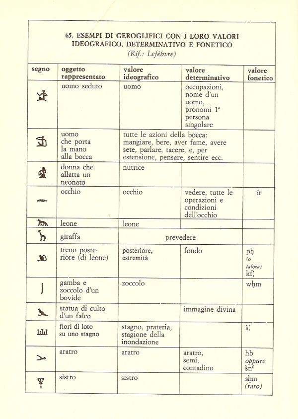 In Egitto le cose, all’inizio si svolgono in modo analogo: un disegno schematico rappresenta l’oggetto in considerazione, come mostrato nella tabella seguente: