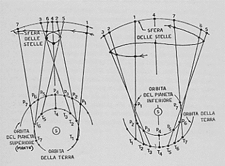 Nella prima figura (tratta da Kuhn) vediamo la traiettoria del Sole proiettata sulle costellazioni dell’Ariete e del Toro. Nella seconda (idem) vediamo, in date diverse, la traiettoria del pianeta Marte visto dalla Terra. Nella terza invece (tratta dal mio libro “La Relatività da Aristotele a Galileo”) si fornisce la spiegazione grafica del moto retrogrado sia per un pianeta superiore (Marte)che per un pianeta inferiore (o Venere o Mercurio). Ora l’astrologia afferma che, quando il moto è regolare, (“stazionario”) allora si hanno degli effetti; quando è retrogrado se ne hanno degli altri: se Venere è stazionaria tutti gli amanti sono felici: sorgono grossi problemi se Venere è retrograda; se Marte è stazionario si è vincenti, altrimenti poveri noi.