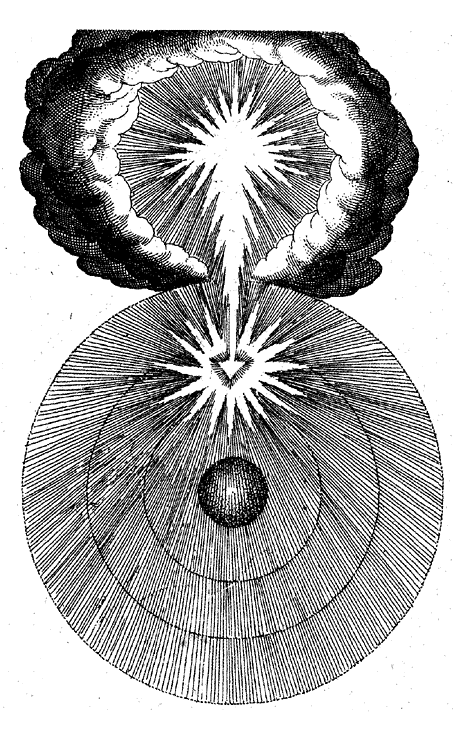 Hermes affermerà varie cose tra cui il fatto che l’elemento che unisce l’uomo a Dio è l’intelletto. Ma l’uomo ha la doppia natura di cui si diceva perché Dio creò un altro Dio (secondo Lattanzio questo era Gesù) e questi era tanto bello che Dio si innamorò di esso. Non ebbe altro rimedio che crearne ancora perché questo Dio aveva bisogno di qualcuno che potesse ammirare le meraviglie del creato. In questo modo venne fuori l’uomo che doveva avere natura spirituale per mettersi in relazione con la divinità ma anche natura materiale per potersi mettere in relazione con il mondo stesso. Colui che dirigeva tutto questo sistema era Giove (questo è un evidente elemento che dice molto sulla sistemazione cronologica di Hermes) sistemato tra cielo e terra. E qui sembra che con Giove ci si riferisca al pianeta poiché poi i riferimenti vanno al Sole ed agli altri pianeti. Quindi ci troviamo immediatamente immersi in una struttura astrologica che lega gli astri alla divinità. È il Sole che dà vita a tutto e “questo Sole, per sua natura, non può che trovarsi al centro del sistema del mondo”, dispensando vita, luce e rappresentando nel modo più imponente la divinità (e la stessa luce non è qualcosa che si differenzia dalla divinità medesima). Vi è quindi una gerarchia nel mondo e tale gerarchia prevede una struttura che è la base dell’Oroscopo che è un qualcosa legato alla divinità. Poiché la rotazione della volta celeste è di 360 gradi, ogni 10 gradi vi è un Dio (anche qui c’è una influenza numerologica: il 10 rappresenta la potente tetrakis davanti alla quale occorre solo inchinarsi) e così vi sono 36 dei nello Zodiaco che rappresentano i decani (nome che deriva da quel 10 che ciascun dio rappresenta). Questa struttura è situata nella sfera delle stelle fisse e questi dei hanno ivi dimora. Più in basso vi sono i sette cieli dei vari pianeti (più Luna e Sole) che sono strettamente legati a Fortuna e Destino. È l’etere che trasmette “informazioni” (anticipo qui che per Newton, che vive immerso in questa cultura, lo spazio è il ‘sensorium Dei’). In fondo alla scala, come anticipato, vi è l’uomo sulla Terra (sotto di essa la demonologia). Osservo a parte che questa struttura è stata stupendamente resa evidente da Dante nella , Divina Commedia, vediFig. 0, tratta da M. Caetani – La Materia della Divina Commedia, 1855).