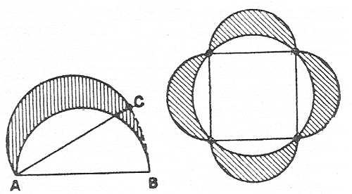 Ippocrate dimostrò che la lunula limitata dall’arco di un quadrante AFC e dalla semicirconferenza AEC, con diametro la corda AC del quadrante, è quadrabile ed equivalente al triangolo rettangolo ADC formato dalla corda e dai raggi corrispondenti ai suoi estremi AD e DC. Questa dimostrazione fece nascere grandi speranze in relazione alla quadratura del cerchio. Si pensava che, essendo riusciti a quadrare una figura limitata da archi di cerchio, ripetendo un certo numero di volte tale operazione sarebbe stato possibile quadrare il cerchio. Ma le cose non stanno così. Ippocrate quadrò altri due tipi di lunule e non riuscì ad andare oltre. Recentemente si è dimostrato che solo 5 tipi di lunule sono quadrabili.