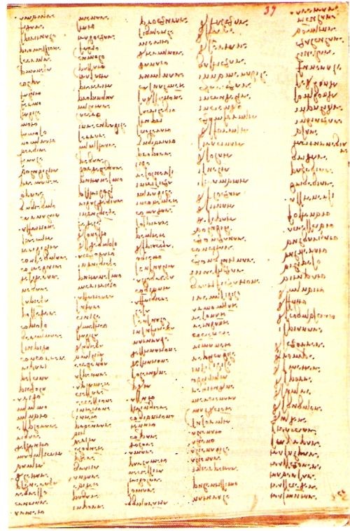 Lista interminabile di vocaboli che Leonardo riportava traendoli da differenti vocabolari per prendere confidenza con tutti i vocaboli che dal latino venivano adattati alla lingua volgare (vi sono 54 pagine così nel Codice Trivulziano). Scrive Marinoni: “capì la sua lingua nativa, il dialetto fiorentino, ed il linguaggio tecnico delle botteghe artigiane gli offrivano una terminologia capace di nominare gli oggetti del mondo visibile e tangibile, ma erano piuttosto scarsi di nomi astratti, aggettivi, avverbi e verbi che solo i letterati conoscevano o fabbricavano ricalcandoli sui corrispondenti della lingua latina, derivandoli da essa.”