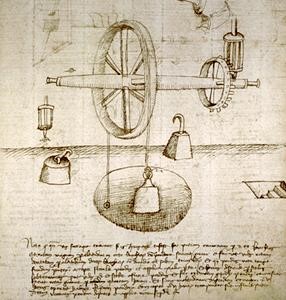 (13) Le fonti di energia che Leonardo utilizza o pensa di utilizzare in suoi diversi scritti sono: quella animale, quella muscolare umana, quella dell’acqua, quella potenziale di pesi opportunamente disposti, qualche volta quella del vento, quella immagazzinata da molle, quella dell’aria calda (nel suo studio di un girarrosto automatico è l’aria calda che viene prodotta dal fuoco e che sale lungo il camino a fare ruotare la ventola che è qui disposta; a sua volta la ventola ruotando trasmette il moto al girarrosto che si trova sul fuoco).