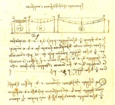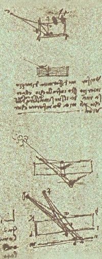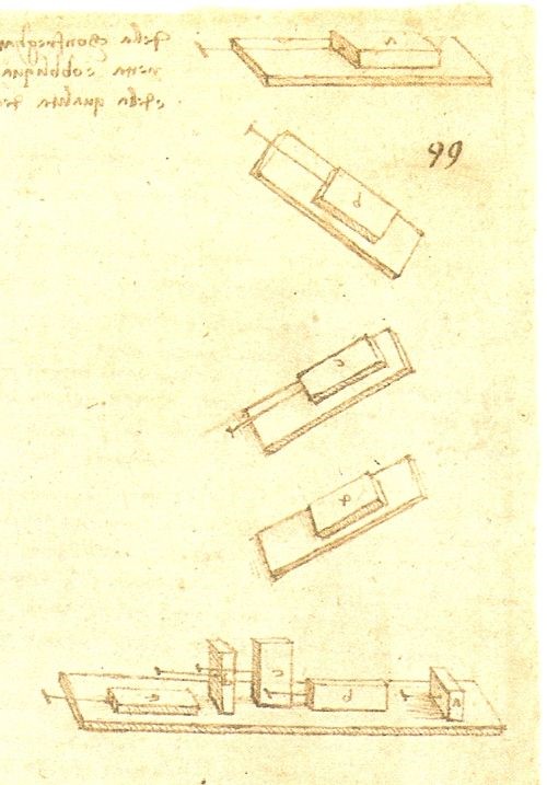 Leonardo proseguì anche gli studi di Giordano Nemorario sulle componenti delle forze, approfondendo il concetto della componente di un peso nel senso della traiettoria considerando anche la componente normale alla traiettoria stessa. Si deve a lui la decomposizione, nel piano inclinato, del peso secondo le sue componenti (parallela al piano e perpendicolare ad esso) e la scoperta del teorema, importante per la risoluzione numerica della composizione o scomposizione delle forze, che oggi possiamo enunciare così: il momento della risultante di due forze concorrenti rispetto ad un punto preso su una delle componenti, è uguale al momento dell’altra componente rispetto allo stesso punto. Questa scoperta è evidentemente legata proprio ai suoi lavori su macchine poiché, risulta evidente, che una tale proprietà non è empiricamente osservabile. Ed il momento fu oggetto di grande studio da parte del nostro applicando tale concetto in modo corretto e completo allo studio di corpi pesanti in rotazione intorno ad assi orizzontali. Egli lavorò anche sui centri di gravità degli oggetti, con le carrucole, con le resistenze di travi e colonne, sia per trazione che per torsione che per appoggio. Fu il primo a studiare meticolosamente con differenti esperienze sia l’attrito radente che quello volvente, occupandosi del problema per aver ben compreso la necessità della lubrificazione degli ingranaggi. Tutto ciò, va detto chiaramente, con un disordine eccezionale nei suoi scritti che, nelle intenzioni, dovevano servire da appunti per qualche pubblicazione e solo in tal senso vanno presi. Sono scritti non per un lettore ma come promemoria personali che, a volte, solo lui era in grado di capire. Spesso ai suoi appunti sono alternati brani copiati da qualche autore che magari avrebbe voluto in seguito citare o avrebbe voluto ampliare. A questo disordine contribuì certamente la dispersione delle migliaia di pagine dei suoi scritti, riordinati a piacimento di chi li ebbe in mano (vedi in proposito quanto detto alla fine della Parte I). Questa oscurità, che discende dalla difficoltà di lettura dei suoi scritti (che molti non hanno fatto, servendosi al più di antologie, me compreso), è alla base della fama di genio che accompagna Leonardo. Come sempre accade questa fama è tra persone non avvezze a studiare ed a capire, affascinate dai misteri, dalla metafisica e dall’ignoto, strada attraverso cui nascono tante leggende sulle quali è possibile manipolare coscienze e mediante le quali scrittori da poco si arricchiscono.