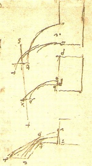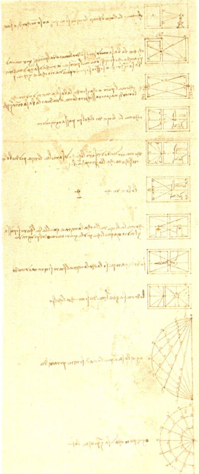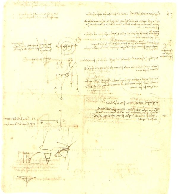 Si verifica allora un fatto singolare: invece di praticare su grande scala una parte qualsiasi dell’arte dell’ingegnere, Leonardo si sforza di completare le conoscenze teoriche che egli ritiene necessarie per raggiungere una sorta di perfezione. Di queste conoscenze egli conserva, per lo meno all’inizio, soltanto quegli elementi che appaiono direttamente e praticamente utilizzabili. Ma, in mancanza di una solida base culturale, le sue conoscenze non si ordinano in un sistema coerente. Di qui derivano quelle incertezze, quelle variazioni nelle soluzioni, e anche quelle confusioni di linguaggio, che si riscontrano quasi in ogni foglio dei suoi quaderni.
