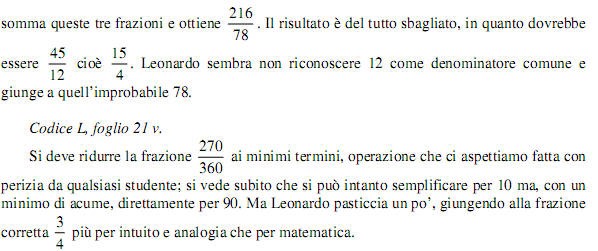 Occorre iniziare a dire che Leonardo, prima della conoscenza di Pacioli litigava anche con l’aritmetica elementare. E’ d’interesse riportare alcuni esempi, come fatto da Bagni e D’Amore dell’Università di Bologna: