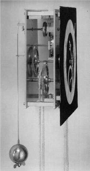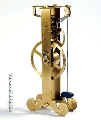 Ricostruzione dell’orologio di Huygens del 1656. nella foto si possono apprezzare le notevoli complicazioni meccaniche rispetto alla spiegazione schematica data sopra (alle corde sono sospese le masse che forniscono l’energia all’orologio; le diverse ruote dentate hanno la funzione di demoltiplicare le rotazioni e di regolare opportunamente l’orologio; altro modo per regolare l’orologio è attraverso la variazione della lunghezza del pendolo; vi sono poi raffinatissimi problemi di regolazione relativi alle variazioni di temperatura per le quali occorre prevedere opportuni materiali con determinati coefficienti di dilatazione).
