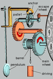 La massa (il cilindro rosso in basso) è appesa ad una corda e, man mano che scende, fa ruotare il cilindro sovrapposto (in colore celeste) a cui è connessa una ruota dentata. Mediante gli ingranaggi sovrapposti, il moto viene trasferito alla piccola ruota dentata che si trova più in alto (in celeste). Su questa piccola ruota agisce il meccanismo dello scappamento ad ancora (in giallo) che fa muovere ritmicamente gli ingranaggi. In assenza di esso vi sarebbe una rotazione continua e veloce di tutte le ruote dentate fino a che la massa non arriva al suolo. Quell’ancora mossa dal pendolo che si trova a sinistra, oscilla con il pendolo in modo da bloccare con i suoi due denti per un breve istante (regolato dal periodo del pendolo) la piccola ruota celeste, una volta da un lato ed una da un altro come mostrato nella figura seguente.