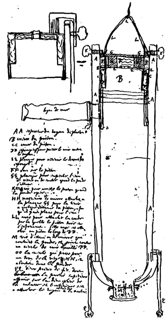 Nei giorni scorsi ho fatto vedere ai signori dell’Accademia nostra e quindi anche al signor Colbert il disegno di una invenzione, che si è giudicata come assai buona e dalla quale mi aspetterei grandi effetti, se fossi sicuro che essa riesca in grande altrettanto bene come è riuscita in piccolo. Si tratta di una nuova forza mobile da ottenersi per mezzo della polvere da sparo e della pressione dell’aria.