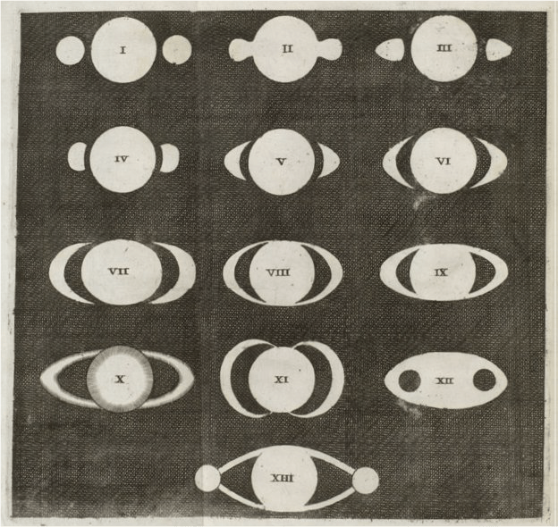 Vari disegni di Huygens relativi alle sue osservazioni di Saturno.