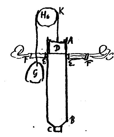 AB è un tubo, ben levigato internamente e di larghezza uniforme. D è uno stantuffo posto in alto nel tubo, che si può muovere dentro di esso, ma che contemporaneamente non può uscire fuori del tubo, poiché ivi è assicurato un riscontro che ne lo impedisce. Sotto al tubo è avvitata una piccola capsula, per la perfetta tenuta della quale si è impiegato del cuoio. Nei punti EE del tubo sono praticate delle aperture e ad esse sono assicurati dei manicotti EF di cuoio bagnato. Nella capsula C si pone, prima di fissarla, un po’ di polvere da sparo con un pezzetto di miccia. Dopo aver acceso questa a una estremità, si fissa la capsula. Il fuoco raggiunge allora la polvere, che infiammandosi riempie il tubo e ne caccia l’aria attraverso le valvole EF, che subito dopo per la pressione dell’aria esterna si chiudono e vengono premute contro le aperture, che sono munite di griglia perché le valvole di pelle non entrino nel tubo. Restando allora il tubo in tal modo vuoto, o quasi vuoto, d’aria, l’aria esterna comprime con grandissima forza lo stantuffo D e lo costringe ad entrare nel tubo, al che esso trascina con sé la corda DK e quindi il peso G, o qualsiasi altra cosa che vi sia attaccata [Huygens, Vol. VII, pagg. 356-358].