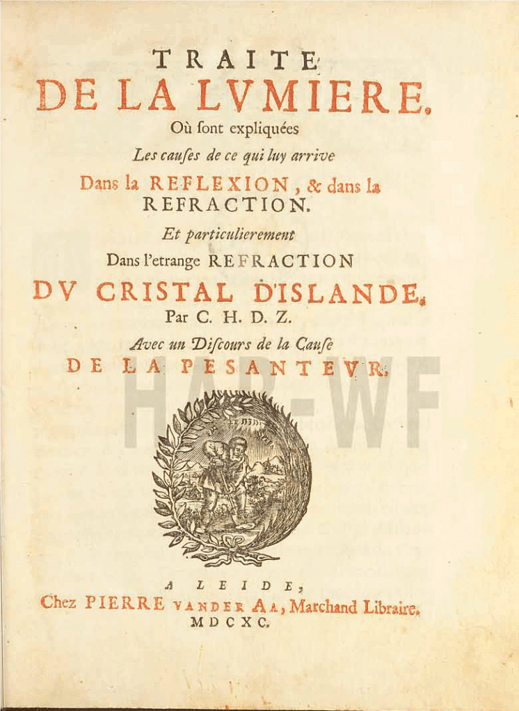 nelle spiegazioni della rifrazione allora in voga in termini di indici di rifrazione dati da un certo rapporto tra la velocità della luce nei due mezzi a contatto. Nel 1678 aveva già scritto un trattato sulla luce, comunicandolo all’Académie, ma non lo aveva pubblicato perché era scritto in un francese molto mediocre. Si riprometteva di tradurlo in latino ed iniziò a farlo. Ma poi lasciò andare fino a decidersi a pubblicarlo così come era nel 1690.