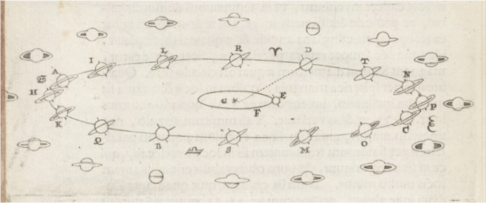 Spiegazione grafica di Huygens del perché, dalla Terra, le osservazioni danno immagini diverse dell’anello di Saturno