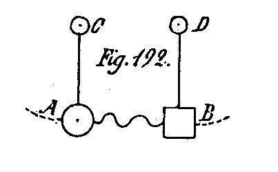 Siano (fig. 192) due corpi A e B connessi da una molla, che, ritornando al suo stato indeformato, agisca su di loro; cioè, se era compressa, respingendoli reciprocamente l’uno dall’altro, se era allungata, attraendoli reciprocamente l’uno verso l’altro; affermo che le velocità che i corpi acquistano sono inversamente proporzionali ai pesi dei corpi. Si supponga infatti che i corpi siano dei pesi da sollevare proprio mentre sono mossi dalla molla, per esempio si supponga che siano su una linea orizzontale e sospesi con funi verticali uguali partenti da C e D; è manifesto che pone più resistenza quello che è sollevato a un’altezza maggiore di quella corrispondente al rapporto inverso dei pesi. Pertanto è necessario che le spinte che i corpi imprimono siano inverse al peso dei corpi (per la prop. 16 del cap. su causa ed effetto). E siccome ciò vale lungo tutto il corso del ritorno allo stato indeformato, anche gli impulsi vivi ottenuti per accumulo da ripetute spinte elementari sempre proporzionali, cioè le velocità finali impresse, saranno inversamente proporzionali ai pesi dei corpi, esattamente secondo la prop. 41 del cap. su causa ed effetto Sez. 4.