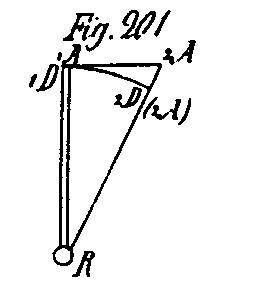 Pertanto così tenderanno a muoversi i corpi A,B, e parimenti il loro centro di gravità comune, come le leggi sopraddette prescrivono, cosicché il centro se prima era in quiete sarà ancora in quiete, se prima si muoveva, tenderà a continuare a muoversi con lo stesso moto in linea retta. E queste spinte elementari non sono impedite nella conversione del moto rettilineo in uno circolare se non per una differenza infinitamente piccola ossia trascurabile. Poniamo infatti (fig. 201) che il punto A tenda ad avanzare lungo la retta 1A2A, ma colpendo in D l’estremità della bacchetta AD sia costretto a ruotare e deviare in (2A) ossia 2D, e invece del segmento 1A2A descriva l’arco 1D2D; è chiaro che all’inizio ossia nel momento stesso della trasformazione del moto rettilineo in una rotazione, la direzione non è variata di una differenza maggiore di quella dell’angolo di contatto, che è infinitamente minore di qualunque tratto rettilineo, e che la differenza fra il segmento 1A2A e l’arco 1D2D è infinitesima rispetto alle due entità differenti, e che quindi la forza centrifuga (che è data dal segmento 2A(2A), cioè dalla differenza fra il raggio di A(2A) e la secante R2A) è infinitamente minore della velocità (che è data dal segmento 1A2A) e perciò all’inizio si deve ritenere nulla la variazione, che infine col progredire del moto diventa apprezzabile per la ripetizione continua; e lo stesso avviene in tutti gli altri punti, che passano da una spinta elementare rettilinea a una rotazione. E un punto che deve essere in quiete in assenza di rotazione, sarà ancora in quiete nonostante la rotazione dei corpi, perché non si può neppure immaginare in esso l’inizio della variazione, ed essendo nullo 1A2A, tanto più è nulla la deviazione e la forza centrifuga, e perciò lo stesso 2A(2A). Pertanto se il centro di gravità è in quiete prima dell’urto, o all’inizio dell’urto, non ha nessuna velocità di avanzamento, e anche dopo, in conseguenza della forza dell’urto e delle spinte elementari, per se rettilinee, sorte da questa, non deve avere nessuna velocità; e anche quando avviene la rotazione non avrà nessun moto; e neppure sarà ruotato, perché abbiamo mostrato che la rotazione non è altro che un moto che per se continuerebbe rettilineo, ma è attualmente deviato da un’alterazione infinitesima. Per ciò stesso quello che abbiamo mostrato per un centro in quiete, si adatta anche ad uno in moto. Poiché infatti si è mostrato nella prop. 15 che le composizioni di moti rettilinei ossia le variazioni dell’ipotesi non cambiano nulla nei fenomeni, possiamo assegnare a tutto l’insieme un moto comune tale, che sia come se tutti i corpi fossero trasportati su una nave, per un osservatore interno alla quale il centro di gravità sia in quiete, anche se a chi osserva in modo assoluto ossia da una riva immobile i fenomeni appaiono uguali a come detto prima. Ma nella nave tutto deve accadere nello stesso modo, sia che la nave si muova sia che stia ferma. Pertanto nella nave anche dopo l’urto seppure nasce una rotazione il centro di gravità sarà in quiete, se era in quiete prima dell’urto; proprio come poco fa abbiamo mostrato che avverrebbe, se il moto della nave non ci fosse, ossia il centro realmente stesse in quiete in assoluto. Intanto il tutto avanzerà col moto della nave ossia col moto comune, e avverrà che per l’osservatore esterno alla nave il centro di gravità, come abbiamo supposto prima dell’urto, avanzerà con la stessa velocità, e quindi parlando in assoluto avanzerà come prima senza alcuna rotazione; gli altri punti (come nella nave) ruotano intorno al centro stesso considerato immobile, e in aggiunta avanzano con lo stesso moto comune rettilineo dell’avanzamento totale; ma in quanto ruotano, compensano vicendevolmente gli avanzamenti e gli arretramenti ossia i moti contrari inversamente proporzionali ai pesi dei corpi per la natura della rotazione, in cui i lati opposti sono trascinati in direzioni contrarie, e in questo modo la forza relativa sempre si conserva; e se tutti i corpi fossero liberati dalla rotazione e seguissero le loro direzioni secondo le tangenti, avrebbero le velocità relative precedenti, che avevano prima della rotazione, e se i corpi rotanti fossero divisi in qualunque modo in due gruppi, avrebbero le loro velocità di allontanamento reciproco inversamente proporzionali ai pesi dei corpi e uguali a quelle che avevano prima dell’urto. Pertanto le velocità relative, e quindi anche le forze relative, si conservano, come nei moti rettilinei attraverso velocità contrarie inversamente proporzionali ai pesi dei corpi, così anche ora nelle rotazioni opposte attraverso le stesse velocità distribuite nella stessa proporzione; mentre intanto aggiungendo, oltre alla forza dei corpi di agire l’uno sull’altro, il moto comune del centro di gravità, ossia di tutto il complesso, ai moti contrari rispettivamente uguali, [ALLORA] anche questa forza di agire comune, ossia la forza complessiva dell’intero complesso o somma totale del moto direzionale è conservata. Del resto nei corpi componenti possono avvenire anche più rotazioni particolari, dove il ragionamento vale anche per ciascun centro particolare.