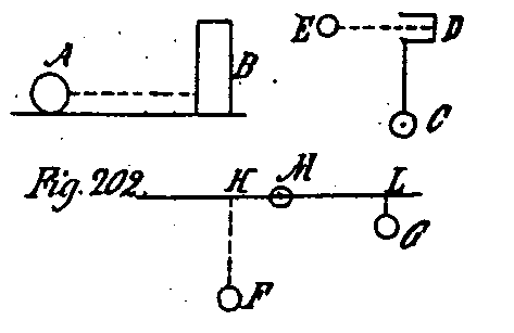 Res etiam ex praecedenti propositione ostendi poterat, hoc modo, quod ubique vires tam respectivae quam progressivae conservantur in motibus rectilineis uniformibus, tales autem sunt omnes (ex praecedenti), posito scilicet adhaesiones quoque seu firmitates et adeo aequidistantiam quoque a centro servatam ex insensibilibus impressionibus ambientium oriri. Sed quia ambientium impressiones a conatibus recedendi gyrantium compensantur nec inde quicquam viribus ipsis corporum insitis a motu rectilineo in gyrum versis derogatur, supereunt eaedem quae ante vires tam totales, quam respectivae, ut explicatum est. Quae sane admirandam nec satis consideratam hactenus Naturae in tuendis legibus constantiam atque harmoniam declaram. Videri poterat fallere regulas nostras, cum (fig. 202) corpus A in corpus aliquod immobile B incurrit; aut cum radius CD circa centrum firmum C mobilis, cavitate seu excipula D capit corpus E rectilineo motu adveniens, et in gyrum cogit; vel cum corpora F et G in libram HML, cujus centrum firmum M, brachia autem opposita HM, LM, incurrunt lineis FH, GL ab eadem parte librae (verbi gratia, ambo tenendo sursum aut ambo deorsum), sed in brachiis oppositis. Tunc enim reflecti potest corporum motorum centrum gravitatis (ut centrum ipsius A a corpore B repulsi), vel in gyrum se flectit, ut E incidens in excipulam D; vel denique reflectitur aut pergit pro ratione situs, ut centrum ipsorum F et G, quodsi incideret in M, reflecteretur.