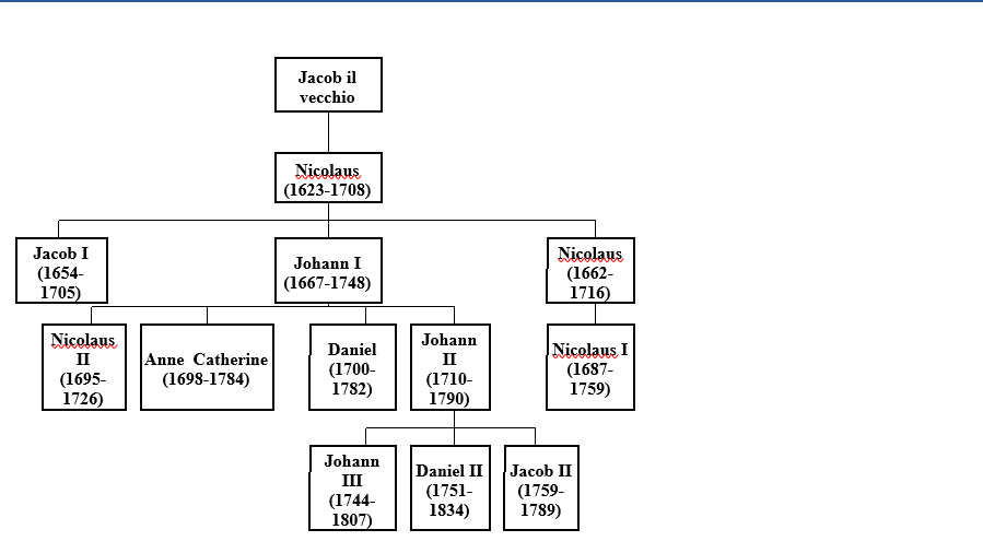 Come osserva Boyer, le scoperte di un grande matematico, come Newton, non diventano immediatamente patrimonio di tutti. Anzi, rischiano di venire dimenticate ed obsolete se non vengono comunicate e se qualcuno non si prende l’onere di divulgarle, approfondirle, diffonderle. In questo senso Newton è un pessimo esempio, egli infatti era incapace di comunicare ed anche il suo metodo, quello delle flussioni era ostico alla divulgazione. Dove mancò Newton, riuscì Leibniz che era invece estremamente disponibile al confronto, alla spiegazione, alla divulgazione delle sue scoperte ad altri scienziati. Tra questi vi furono due eminenti studiosi e scienziati che si assunsero il ruolo di proseguire la sua opera, due fratelli di una famiglia con una storia travagliata, Jacob e Johann Bernoulli.(27) Il primo personaggio noto della famiglia è Jacob il Vecchio, ugonotto belga costretto a fuggire a Basilea in Svizzera nel 1583 per le persecuzioni dei cattolici spagnoli. Un suo figlio, Nikolaus, fu il padre dei due Bernoulli citati che, a loro volta, dettero vita a molti altri noti matematici e fisici come mostrato nella genealogia seguente.