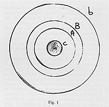 Il lavoro di Bartoli, Sopra i movimenti prodotti dalla luce e dal calore e sopra il radiometro di Crookes (Le Monnier, 1876), è uno studio teorico di grande rilievo in cui si hanno ben presenti tutte le problematiche della termodinamica dell’epoca, a partire da quella del corpo nero (14). Bartoli elabora la sua teoria servendosi di una esperienza ideale (15). Egli suppone di avere un corpo nero sferico C contenuto in una superficie sferica concentrica b, anch’essa nera. Tra b e C sono interposti due involucri sferici concentrici B ed A (con B più grande di A), sottilissimi e perfettamente riflettenti sia sulle loro superfìci interne che esterne (Fig. 1). Il corpo C viene supposto trovarsi inizialmente in