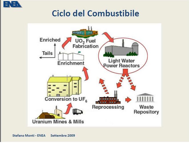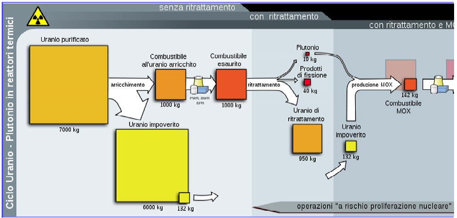 Ciclo attuale del combustibile nucleare all’uranio per 1000 kg di combustibile in reattori a neutroni termici. A partire dall’uranio purificato, si ottiene il combustibile arricchito (al 3.5% di U235) ed una grande quantità di uranio impoverito di scarto. Dopo l’uso in reattori, si ottiene il “combustibile esaurito” (linea nera continua del grafico delle radiotossicità sopra riportato) che è estremamente più pericoloso e radiotossico dell’uranio di partenza. La maggior parte dei paesi dotati di impianti nucleari (per es. gli USA) considerano il combustibile esaurito come scorie nucleari da smaltire. Il combustibile esaurito può essere riprocessato per separarne le componenti, con particolare interesse per il plutonio, considerando come scorie solamente i prodotti di fissione (linea rosa del grafico delle radiotossicità); si ricava anche una gran quantità di uranio di ritrattamento che tuttavia non è adatto al riutilizzo in reattori nucleari in quanto contaminato da altri atomi pesanti (attinoidi).
