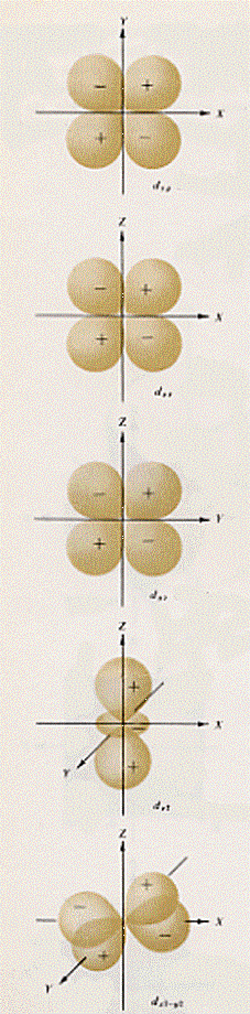 In definitiva: la funzione d’onda y è l’orbitale atomico e la densità di probabilità di trovare l’elettrone in questo orbitale ci è data da y modulo quadro; ogni elettrone ha associati quattro numeri quantici e, per il principio di Pauli, in un atomo non vi possono essere due elettroni con tutti e quattro i numeri quantici uguali o, che è lo stesso, su di un orbitale vi possono essere due elettroni solo se questi hanno spin opposti; così come i livelli energetici della teoria di Bohr-Sommerfeld, anche gli orbitali hanno energie caratteristiche (in un orbitale se vi sono orbitali diversi con identiche energie, questi orbitali sono chiamati degeneri); tra orbitali diversi possono avvenire transizioni di elettroni (se la transizione avviene da un orbitale ad energia più bassa ad uno ad energia più alta si ha assorbimento di un fotone hn; per la transizione inversa si ha emissione di un fotone di energia hn) e queste transizioni hanno luogo solo tra determinati orbitali così come ci dicono alcune regole (che non abbiamo studiato per non appesantire il discorso) dette di selezione; la somma delle energie di tutti gli orbitali atomici occupati da elettroni ci fornisce l’energia elettronica totale dell’atomo in questione. Nelle figure seguenti sono riportate le superfici limite dei tre orbitali 2p (già visti) e dei 5 orbitali 3d (abbiamo già visto che gli s sono sferici), superfici che sono state trovate andando a considerare i punti in cui la y è costante (i segni + o – che si trovano in figura indicano le regioni in cui y è positiva o negativa; dobbiamo avvertire, comunque, che il + ed il – non debbono essere in alcun modo pensati legati ad una qualche carica elettrica):