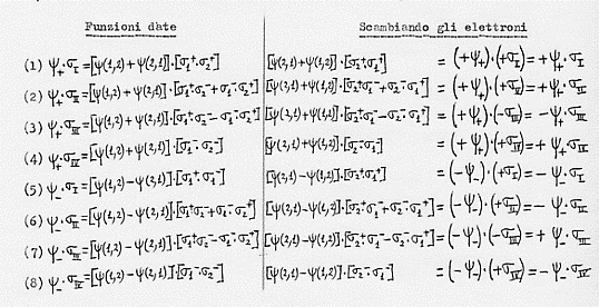 In base allora al principio di Pauli ora enunciato, delle otto funzioni d’onda complete che sono state ottenute nella Tavola 2 per un sistema di due elettroni interagenti, solo quattro sono permesse dal principio in oggetto, la (3), la (5), la (6), la (8); cioè: