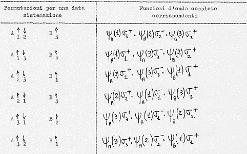 (6) Per capire perché nella Tavola figurano dei prodotti tra funzioni d’onda complete, si rivedano i concetti elementari della probabilità composta. Qui, come esempio, diciamo solo che la prima funzione che figura nella Tavola rappresenta il verificarsi simultaneo dei seguenti eventi: elettrone 1 vicino al nucleo A con lo spin rivolto verso l’alto; elettrone 2 vicino al nucleo A con lo spin rivolto verso il basso; elettrone 3 vicino nucleo B con lo spin rivolto verso l’alto.
