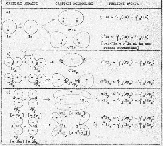 Prima di chiudere questo paragrafo e di passare allo studio di qualche molecola, è necessario fare ancora una piccola osservazione che il lettore più accorto avrà già fatto da sé. Perché nel caso di molecole biatomiche omonucleari non si combinano l’orbitale atomico 1s di un atomo con l’orbitale atomico 2s dell’altro ? E perché non si combinano tra loro, sempre nel caso di molecole biatomiche omonucleari, orbitali atomici di tipo s con orbitali atonici di tipo p ? La risposta è evidente e non vale nemmeno la pesa di commentarla: per atomi dello stesso elemento le energie dell’ 1s e del 2s (degli s e dei p) non sono confrontabili così come richiesto dalla prima delle tre condizioni necessarie per la formazione di orbitali molecolari.