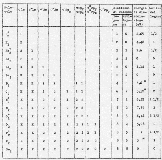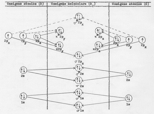 La molecola O2 ha quindi 2 elettroni disaccoppiati (con spin paralleli). Questi elettroni disaccoppiati rendono conto del fatto sperimentale che la molecola di ossigeno ha particolari proprietà magnetiche (è paramagnetica). E la spiegazione così elegante di questo fenomeno (insieme ad una analoga spiegazione del paramagnetismo della molecola S2 di zolfo)(12), fornita dalla teoria O.M., costituì uno dei suoi primi successi (la teoria del legame di valenza non prevedeva l’esistenza di due elettroni disaccoppiati e quindi non spiegava il paramagnetismo dell’ossigeno).