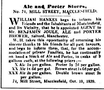 Una pubblicità della birreria Joule. Un gallone di birra a bassa gradazione viene offerta ad uno scellino circa. Tratta da: http://www.breweryhistory.com/journal/archive/115/bh-115-002.html