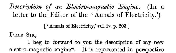 Non posso dubitare del fatto che l’elettromagnetismo finirà col sostituire il vapore nella propulsione di macchine. Se la potenza del primo è in proporzione alla forza attrattiva dei suoi magneti e se quest’attrazione è come il quadrato della forza elettrica, l’economia sarà in rapporto diretto alla quantità di elettricità e il costo di operazione della macchina può essere ridotto all’infinito.
