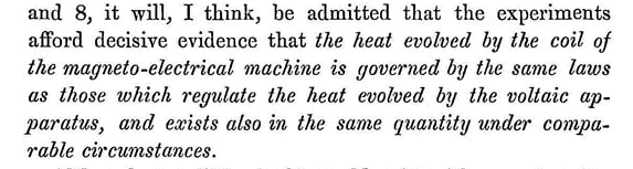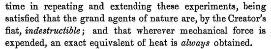 Non perderò tempo a ripetere e ad estendere questi esperimenti, essendo soddisfatto di avere accertato che i grandi agenti della natura sono, per virtù del fiat del Creatore, indistruttibili; e che qualunque forza meccanica venga spesa, si ottiene sempre un equivalente esatto del calore.
