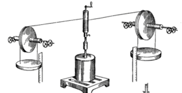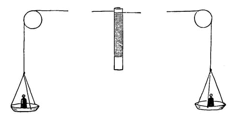 Per fare ciò confrontò i risultati dell’esperienza che aveva proposto nella prima parte della memoria con quella che proponeva ora e che consisteva nel cambiare il meccanismo di rotazione dell’elettromagnete all’interno del tubo di vetro con un sistema meccanico che permettesse di misurare il lavoro fatto con notevole precisione in sostituzione della manovella. Due cordicelle sottili, avvolte intorno ad un cilindro e passanti su due pulegge, erano in grado di far ruotare il medesimo cilindro mediante la caduta di pesi sospesi alle loro estremità. Questo era il sistema che egli utilizzò per sostituire la manovella della precedente esperienza (figura seguente).