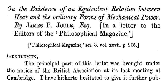 Nel giugno 1845 Joule presentò una comunicazione alla riunione della British Association a Cambridge. Un breve resoconto della comunicazione, On the Mechanical Equivalent of Heat, fu pubblicato nei Brit. Assoc. Rep., trans.
