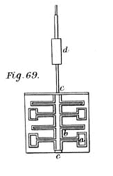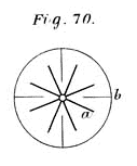 Disposizione vista dall’alto delle palette del calorimetro. Si tratta di un albero rotante (c, c) su cui sono fissate otto (per due) palette (a, a) che ruotano solidalmente in mezzo a quattro ostacoli fissi (b, b), in modo da produrre il massimo attrito con il liquido disposto nel calorimetro. Si deve notare che le palette radiali fisse avevano uno scopo ben preciso: evitare che l’acqua acquistasse energia cinetica di movimento (facesse mulinello trascinata dalle palette rotanti).