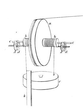 Una delle due pulegge a (un piede di diametro e 2 pollici di spessore) che ruota su un asse (2 pollici di diametro). In primo piano vi è un’asta graduata k che scende fino al suolo (altezza totale h = 150 cm). Subito dietro vi è un grosso peso e (dai 13 ai 5 Kg per diverse esperienze) che scende srotolando le due cordicelle arrotolate sull’asse b, b della puleggia a cui è appeso. La cordicella in alto che va verso destra è connessa al cilindro centrale f.