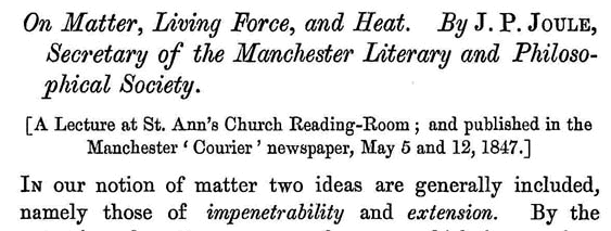 Nel 1847 Joule tenne una conferenza nella sala di lettera della Chiesa di Sant’Anna a Manchester, On matter, Living Force, and Heat, che fu pubblicata sul Courier della città (maggio 1847). Si tratta di una sorta di resoconto quasi divulgativo delle ricerche che aveva fino ad allora fatto.