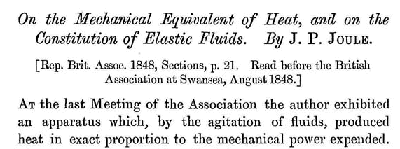 Nel 1848 Joule presentò alla Manchester Society ed alla riunione di Swansea della British Association un altro lavoro di grande importanza, On the Mechanical Equivalent of Heat, and on the Constitution of Elastic Fluids (Rep. Brit. Assoc. 1848, Sections, p. 21. Letta prima alla British Association at Swansea, Agosto