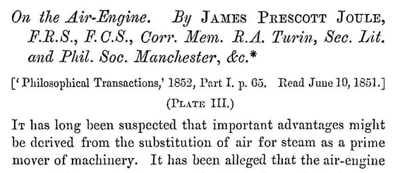 Nel 1851 Joule scrisse un lavoro d’interesse, On the Air-Engine (Philosophical Transactions, 1852, Part I. p. 05. Read Juue 10,1851). In esso si descriveva il funzionamento di una macchina ad aria calda che poteva funzionare in un ambito