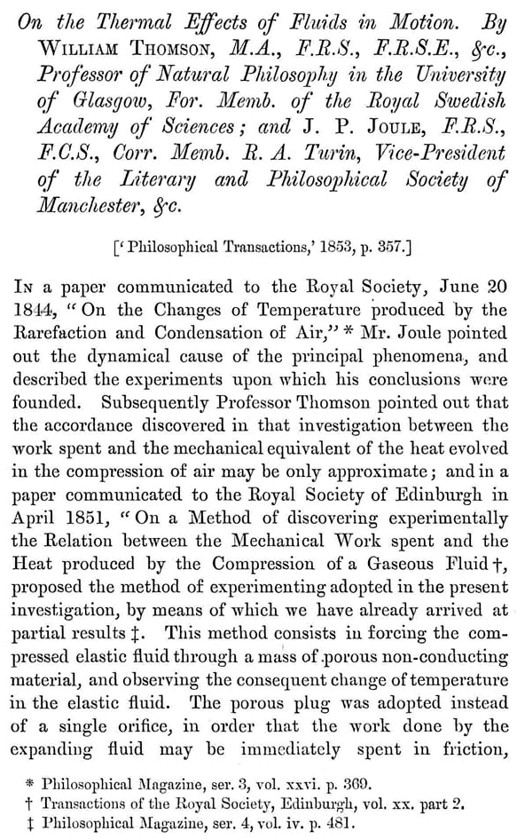 Il lavoro sull’effetto Joule-Thomson produsse varie ed articolate memorie piene di misure e di elaborazioni teoriche sviluppate con la grande abilità matematica di Thomson. La prima di queste memorie, On the Thermal Effects of Fluids in Motion, fu pubblicata nel 1853 sulle Philosophical Transactions of Royal Society (riporto di seguito tutta la prima pagina di tale lavoro perché in essa vi è un sunto di come si è arrivati a scrivere la memoria e cosa essa si propone).