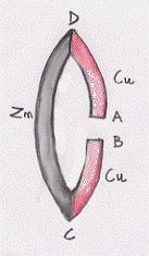 (4) L’effetto Peltier. A seguito delle scoperte di Volta, vi fu un’intensità di ricerche che ruotavano intorno alle catene aperte o chiuse di conduttori di prima classe. Il fisico tedescoThomas JohannSeebeck (1770 – 1831) scoprì un effetto che porta il suo nome (1821): in una catena aperta di tre conduttori di prima classe ad estremi uguali, la differenza di potenziale agli estremi non è nulla se le due saldature non sono alla stessa temperatura. Riferendoci alla figura, se si ha una catena aperta di rame, zinco, rame e le saldature C e D sono alla stessa temperatura, allora tra A e B non vi è differenza di potenziale. Ma scaldando una delle due saldature, tra A e B si crea differenza di potenziale, entro certi limiti tanto maggiore quanto maggiore è la differenza di temperatura tra C e D (con opportuni arrangiamenti, fatti da Macedonio Melloni, si riesce ad avere una sensibilità di un milionesimo di grado). Si noti comunque che tale effetto è piccolo, tanto che esso è utilizzato come termometro di estrema sensibilità (termocoppia). Con opportuni arrangiamenti, fatti da Macedonio Melloni, si riesce ad avere una sensibilità di un milionesimo di grado.