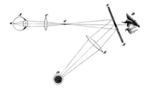 Principio di funzionamento dell’oftalmoscopio: l’occhio del paziente è guardato attraverso un foro che si trova nel mezzo di uno specchio concavo che illumina l’occhio osservato riflettendo la luce di una sorgente.