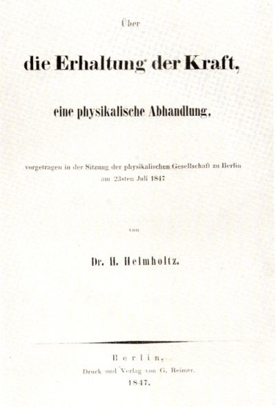 Il 23 luglio del 1847, alla Società Fisica di Berlino, il ventiseienne Helmholtz lesse la sua memoria Über die Erhaltung der Kraft (Sulla conservazione della forza(1)) e quindi, dopo il rifiuto di pubblicazione da parte di Poggendorf sugli Annalen der Physik und Chemie (troppo lungo, disse, ma in realtà vi era la posizione di Poggendorf che non avrebbe mai sacrificato un lavoro sperimentale per una elaborazione teorica), la pubblicò privatamente presso l’editore G. Reimer. Anche qui la cosa non fu facile perché Reimer non pubblicava qualunque cosa; furono necessarie lettere di raccomandazione di suoi estimatori Müller, Du Bois Reymond, Magnus (un collaboratore degli Annalen). Reimer accettò ed Helmholtz, che continuava in ristrettezze economiche, chiese che gli fosse fatto un buon prezzo perché si trattava di sole 15 copie; Reimer, alla fine del lavoro che tra l’altro non richiedeva lamine incise di rame per le figure, con sorpresa di Helmholtz, lo pagò. Si tratta di uno dei capisaldi del pensiero scientifico che colloca l’autore tra i grandi pensatori scientifici dell’Ottocento.