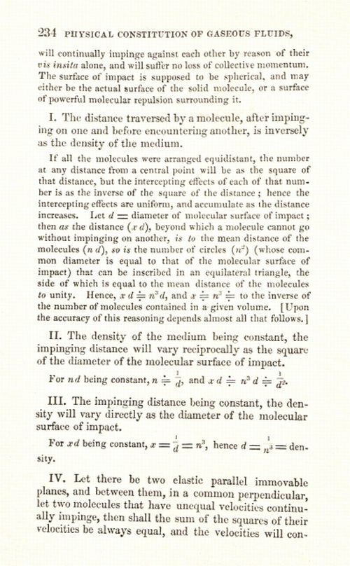 essere considerato rettilineo. Tali corpuscoli erano altresì supposti come perfettamente lisci: un eventuale moto rotatorio intorno all’asse passante per il loro centro avrebbe potuto così essere trascurato e la loro velocità sarebbe stata calcolata esclusivamente in relazione alla velocità del centro. Il sistema così descritto prevedeva una quantità considerevole di collisioni, responsabili a livello microscopico dei fenomeni macroscopicamente controllabili in termini di volume, pressione e temperatura; queste proprietà non erano più distinte in due classi, l’una concernente la densità e la pressione, l’altra riguardante la relazione tra calore ed espansione, ma riunite sotto l’unica tesi della struttura corpuscolare della materia.