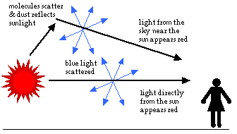 Al tramonto, in direzione del Sole, la luce fa un lungo tragitto nell’atmosfera e la luce blu, prodottasi all’inizio, subisce ulteriori scattering