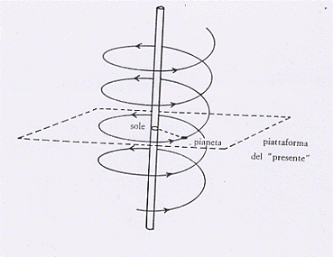 Altro esempio di rappresentazione spazio temporale è quello della rotazione di un pianeta intorno al Sole. Poiché il sole si sposta velocissimamente verso Andromeda, un pianeta nello spazio-tempo non chiude l’orbita che risulta invece essere una spirale:
